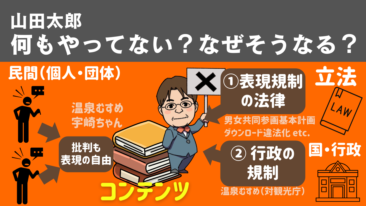 このように国会質疑を非常に有効に使い、「言質」を取りながら表現規制を防ぐという方法を得意としているのが山田太郎議員なのです。